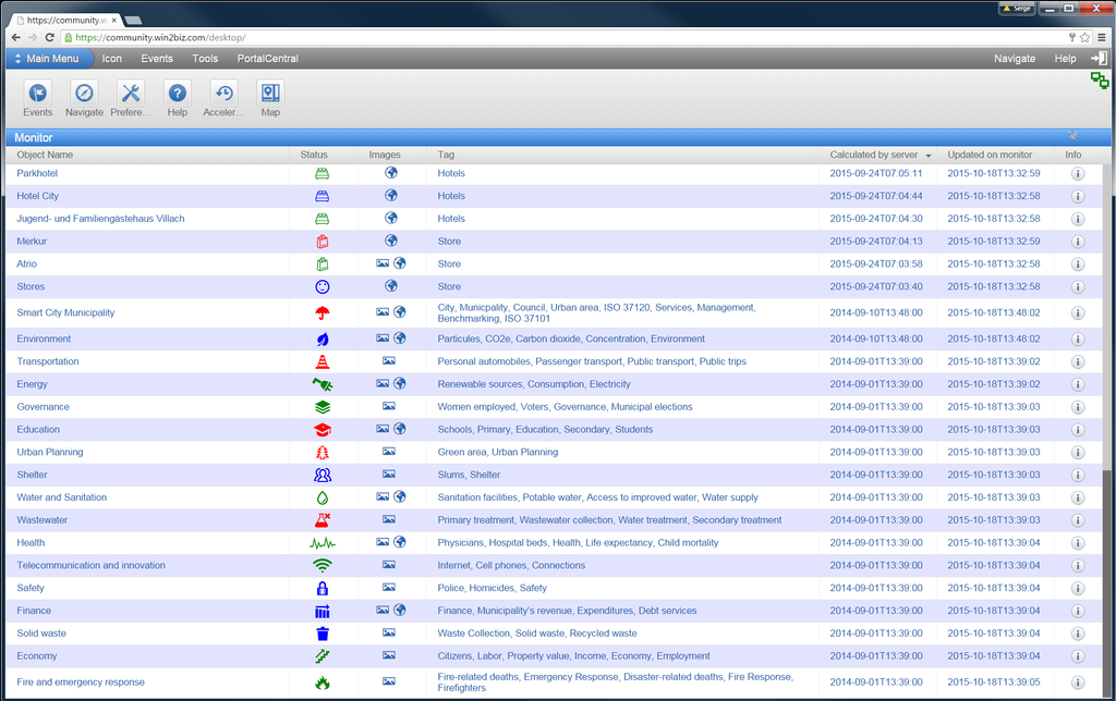 After a click on the Monitor toolbar icon ISO31720, the dashboard presents only the objects that are included into Smart City ISO 37120 Model as theme-objects to simplify the monitoring, benchmarking and analysis of a city accordingly to the Standard.